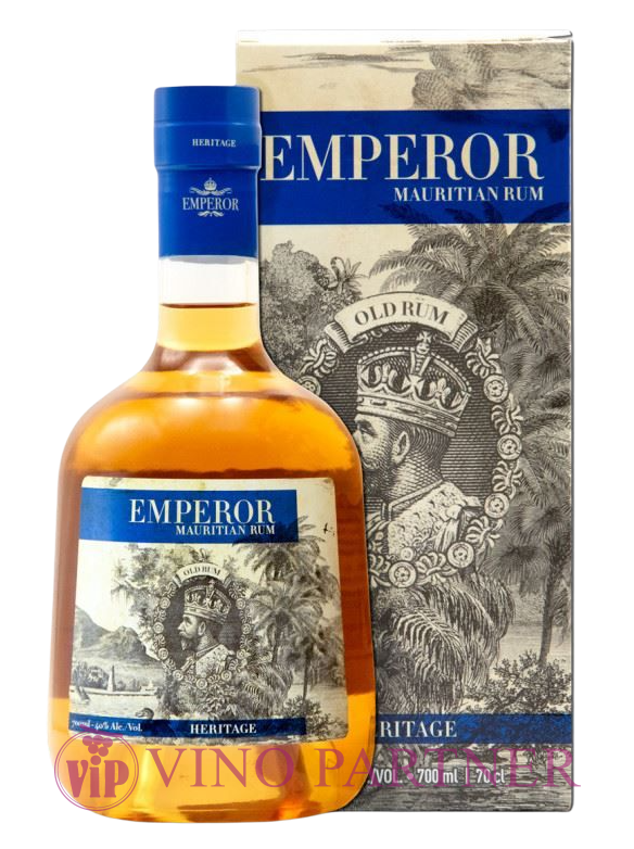 EMPEROR HERITAGE je sofistikovaný blend 5-12 let starých vybraných výrobních šarží, připravený z vybraných ostrovních rumů, jak tradičních/ melasových (cca 60%),tak i Agricole (čerstvá třtinová šťáva). Při výrobě je použit „pot-still“ (kotlíkový) i „column“ (kontinuální) způsob destilace, staření probíhá v sudech jak z amerického, tak i francouzského dubu. Výsledkem je ohromující a komplexní variace barev, vůní a chutí – od čerstvosti vylisované třtinové šťávy či exotického ovoce a rostlin přes typicky mauricijské lehce kořeněné stopy až po konzistentní hřejivost s vanilkovými tóny. Krásná jantarová barva umocňuje dojem z tohoto charakterního a delikátního rumu. Majestátní vyznění produktu umocňuje balení do noblesní láhve a stylové dárkové tuby s tematickými motivy ikony krále Jiřího V.